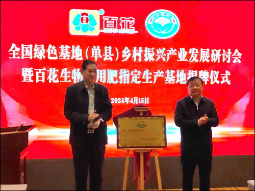 2024年4月15日,全國(guó)綠色基地(單縣)鄉(xiāng)村振興產(chǎn)業(yè)發(fā)展研討會(huì)在單縣中領(lǐng)國(guó)際酒店召開,同時(shí)為山東百花生物集團(tuán)有限公司舉行“全國(guó)綠色農(nóng)業(yè)產(chǎn)業(yè)專用肥指定生產(chǎn)基地”揭牌儀式。